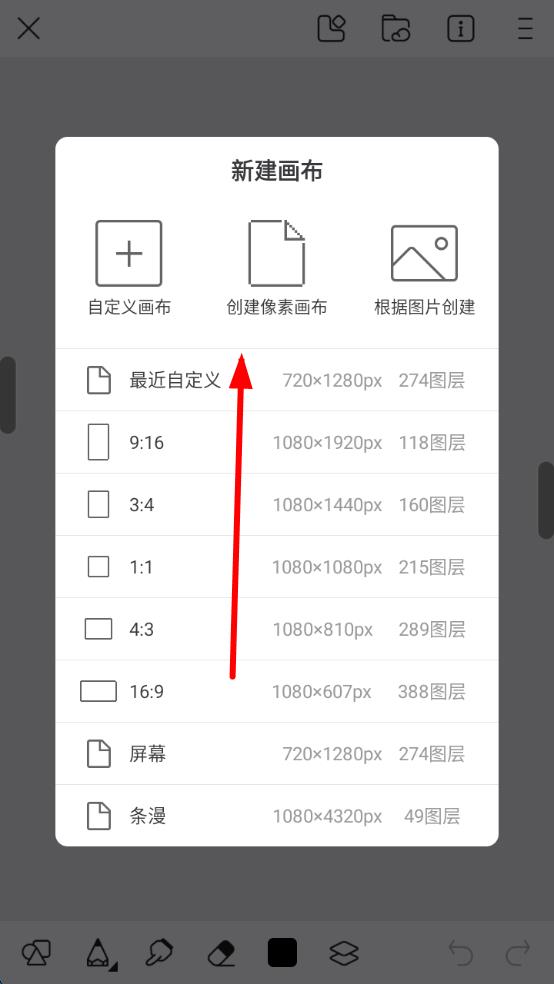 2、在新建畫布彈窗中,選創(chuàng)建像素畫布或其他合適類型,建立繪畫基礎載體。