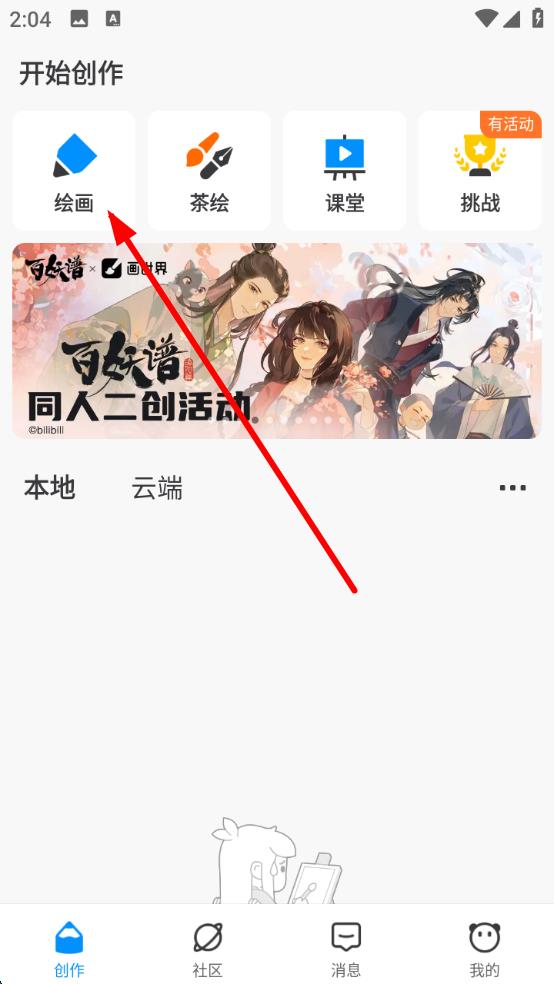1、打開熊貓繪畫,點擊繪畫選項,進入創(chuàng)作頁面開啟繪畫之旅。