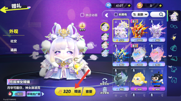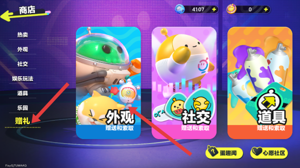 2、進(jìn)入商城界面后,點(diǎn)擊左側(cè)菜單欄中的贈禮選項(xiàng),選擇外觀。