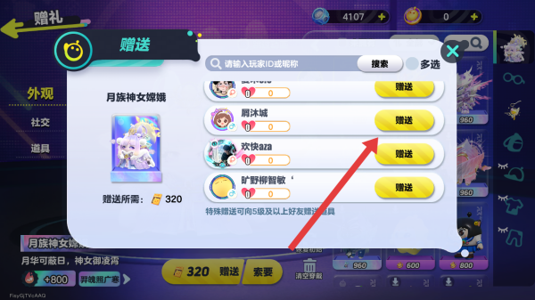 4、在彈出的好友列表中,輸入好友的ID或昵稱進(jìn)行搜索,點(diǎn)擊右側(cè)對應(yīng)的贈送按鈕。