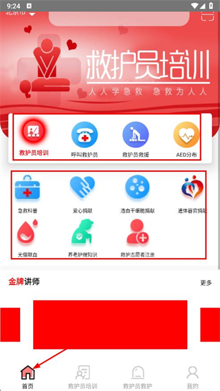 1、首頁(yè)有救護(hù)員培訓(xùn)、呼叫救護(hù)員、救護(hù)員救援、AED分布等多種急救相關(guān)服務(wù)入口,還有急救科普、愛(ài)心捐獻(xiàn)等功能入口,可按需點(diǎn)擊使用。