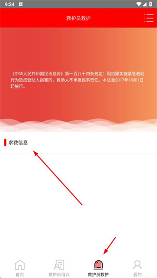 3、點(diǎn)擊底部導(dǎo)航欄的救護(hù)員救護(hù),進(jìn)入頁(yè)面可查看求救信息,根據(jù)自身情況選擇是否參與救援。