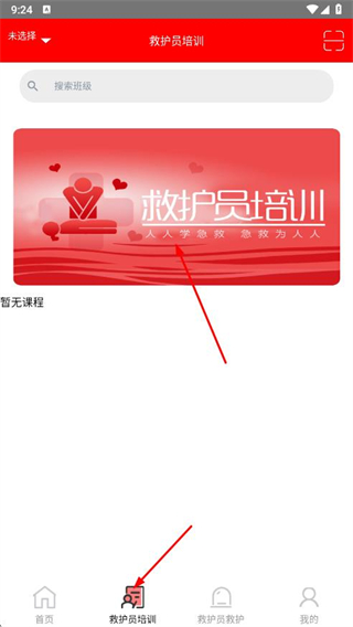 2、點(diǎn)擊底部導(dǎo)航欄的救護(hù)員培訓(xùn)進(jìn)入相關(guān)頁(yè)面,可搜索培訓(xùn)班級(jí),參與線上或線下的救護(hù)員培訓(xùn)課程,提升急救技能和知識(shí)儲(chǔ)備。