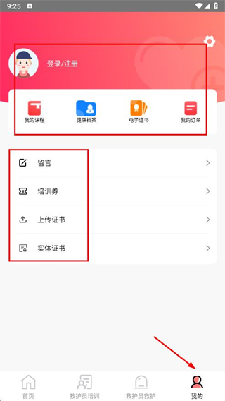 4、點(diǎn)擊底部導(dǎo)航欄的我的,進(jìn)入個(gè)人中心,可進(jìn)行登錄/注冊(cè)操作,管理我的課程、健康檔案、電子證書(shū)、我的訂單等信息。
