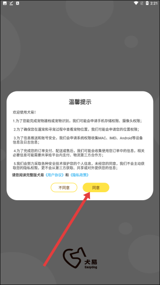 1、在溫馨提示彈窗中點(diǎn)擊同意按鈕,接受《用戶協(xié)議》和《隱私政策》,開啟APP使用流程。