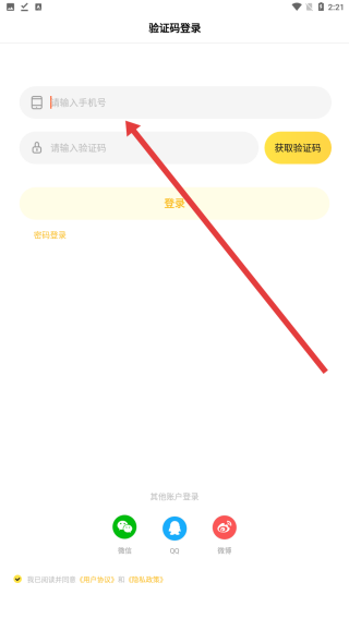3、在驗(yàn)證碼登錄界面,需要點(diǎn)擊手機(jī)號(hào)輸入框,填寫號(hào)碼后準(zhǔn)備獲取驗(yàn)證碼,推進(jìn)登錄步驟。