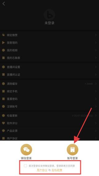 3、在彈出的注冊模式中,選擇賬號登錄,并勾選用戶協(xié)議以及隱私政策。
