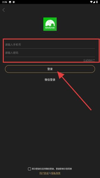 4、在此頁面內(nèi),輸入手機號以及密碼,點擊登錄即可完成注冊。