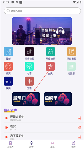 2、在彩鈴頁面,點(diǎn)擊最熱門等音樂榜單入口,進(jìn)入音樂列表頁面。