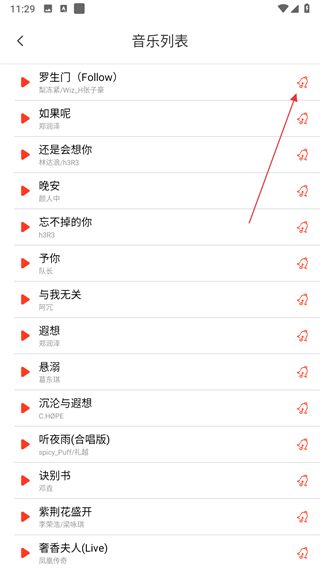 3、在音樂列表頁面,點(diǎn)擊目標(biāo)歌曲右側(cè)的設(shè)置圖標(biāo),觸發(fā)設(shè)置選項(xiàng)彈窗。