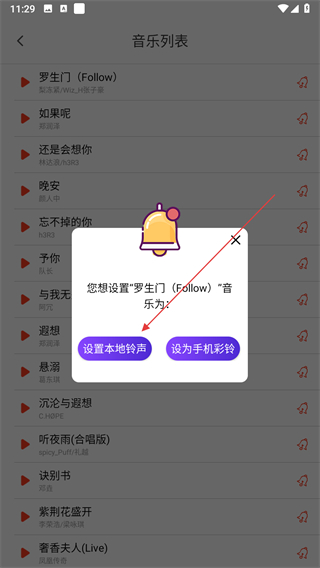 4、在彈出的設(shè)置選項(xiàng)彈窗中,點(diǎn)擊設(shè)置本地鈴聲按鈕,即可將該歌曲設(shè)置為手機(jī)本地鈴聲。