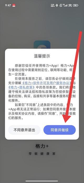 1、打開格力+App,在溫馨提示彈窗中點(diǎn)擊同意并繼續(xù),接受服務(wù)協(xié)議與隱私政策,進(jìn)入應(yīng)用主界面。