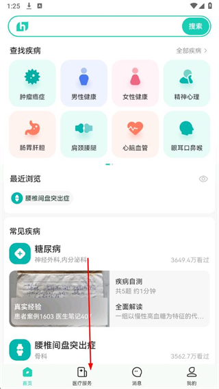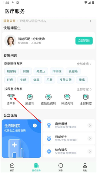 2、在醫(yī)療服務(wù)頁(yè)面,點(diǎn)擊按科室找專(zhuān)家中的科室,進(jìn)入醫(yī)生列表頁(yè)面。
