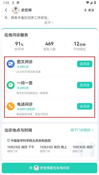 4、進(jìn)入醫(yī)生詳情頁(yè)面,選擇在線問(wèn)診服務(wù)類(lèi)型,點(diǎn)擊對(duì)應(yīng)服務(wù)右側(cè)的去問(wèn)診。