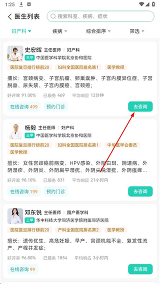 3、在醫(yī)生列表中,選擇想要咨詢的醫(yī)生,點(diǎn)擊右側(cè)的去咨詢按鈕。