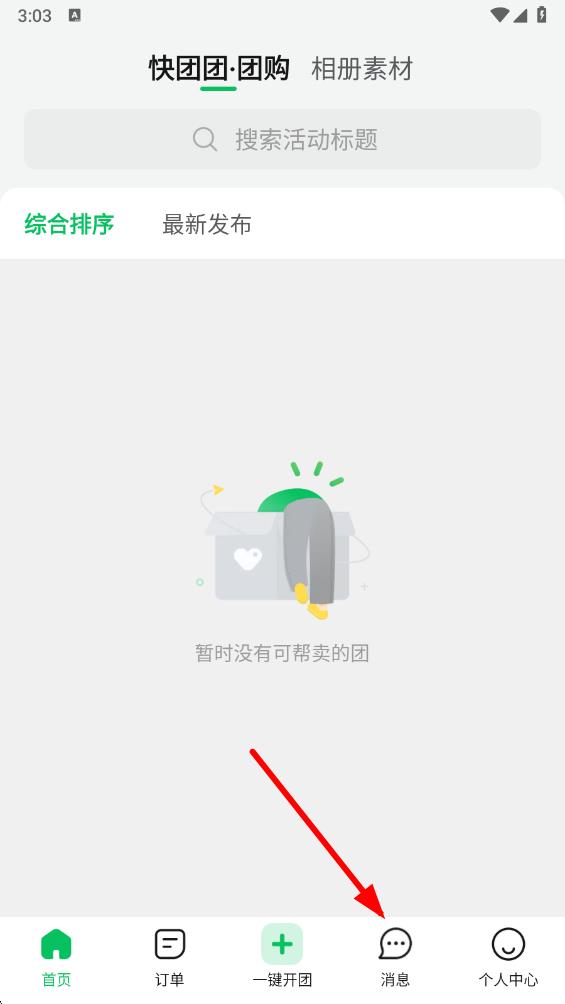 1、打開(kāi)快團(tuán)團(tuán)app,點(diǎn)擊底部導(dǎo)航欄中的消息。