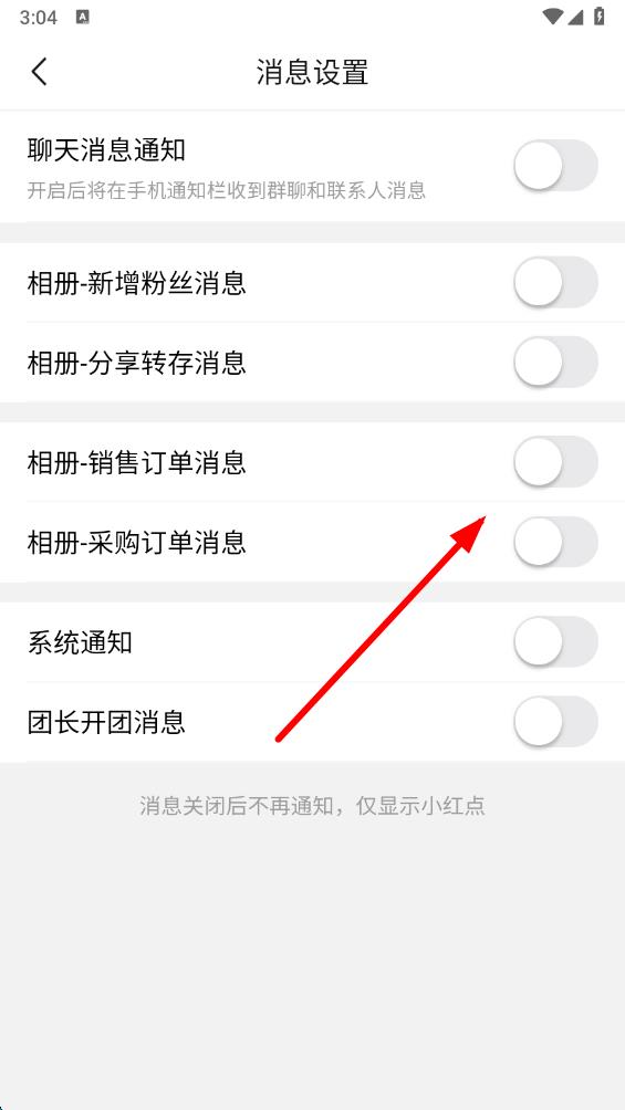 4、將需要關(guān)閉的消息通知選項(xiàng)對(duì)應(yīng)的開(kāi)關(guān)按鈕滑動(dòng)至關(guān)閉狀態(tài),即可完成消息通知的關(guān)閉操作。