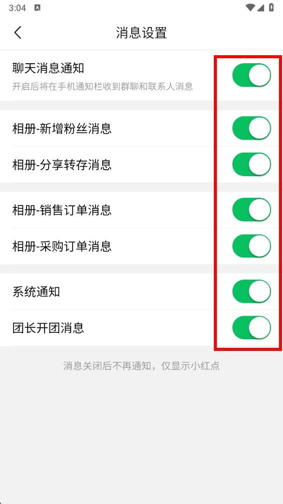 3、在消息設(shè)置頁(yè)面,能看到各類(lèi)消息通知選項(xiàng),如聊天消息通知、相冊(cè)訂單消息等是開(kāi)啟狀態(tài)。