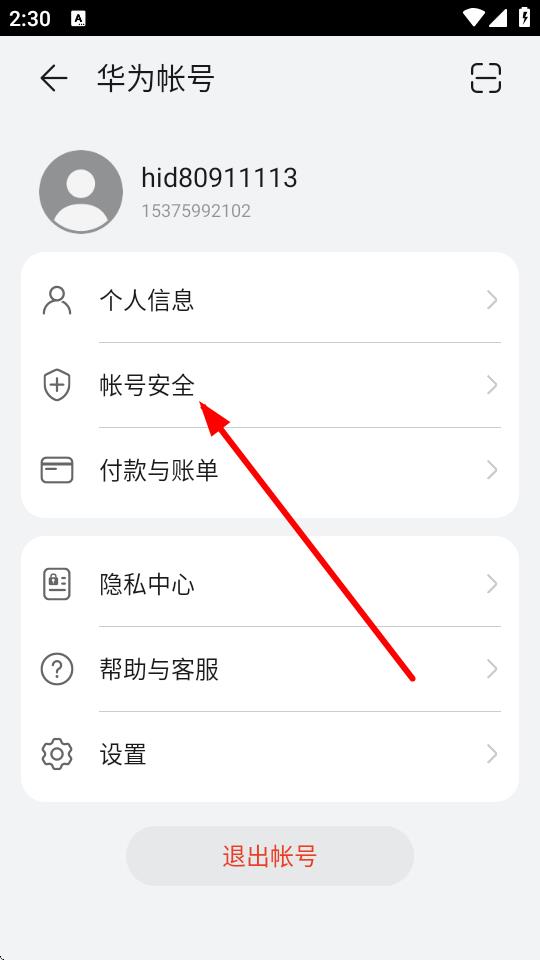 3、在華為帳號頁面里,點擊帳號安全選項。