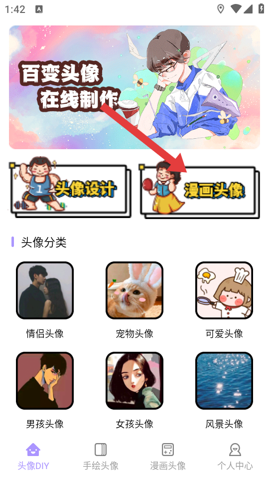 1、在頭像DIY的頁面,點(diǎn)擊漫畫頭像的選項(xiàng),進(jìn)入漫畫頭像制作引導(dǎo)頁。