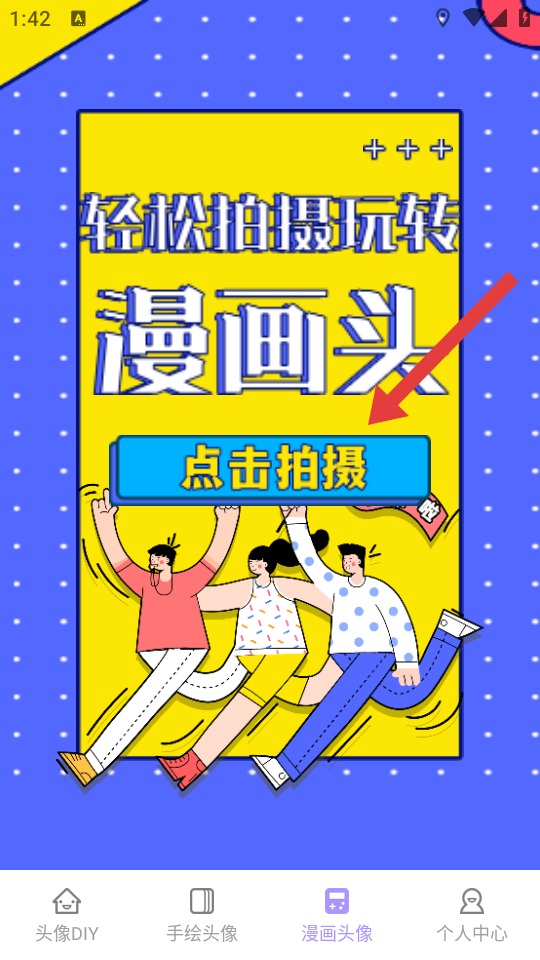 2、在漫畫頭像制作引導(dǎo)頁,點(diǎn)擊點(diǎn)擊拍攝按鈕,進(jìn)入拍攝照片界面。