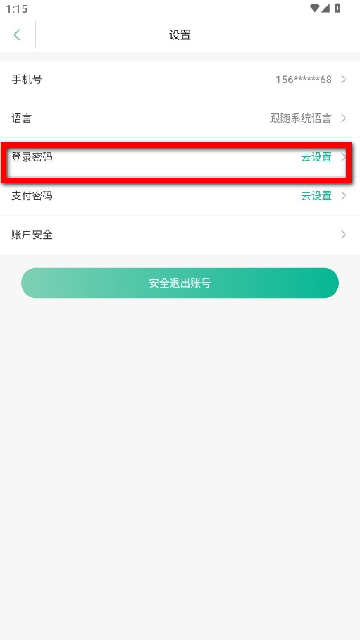 3、在設(shè)置界面,點(diǎn)擊登錄密碼后的去設(shè)置選項(xiàng),進(jìn)入密碼設(shè)置頁(yè)。