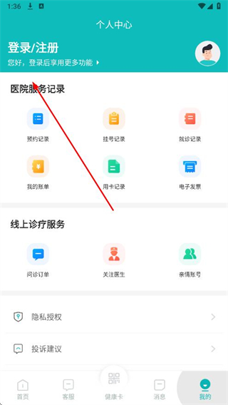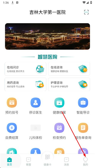 1、打開(kāi)吉大一院智慧醫(yī)院app,點(diǎn)擊底部導(dǎo)航欄中的我的選項(xiàng)。