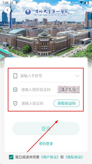3、輸入手機(jī)號(hào)、驗(yàn)證碼,勾選同意用戶協(xié)議和隱私協(xié)議,點(diǎn)擊登錄。