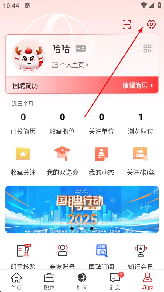 2、在我的頁面,點擊右上角的設(shè)置圖標(biāo)。