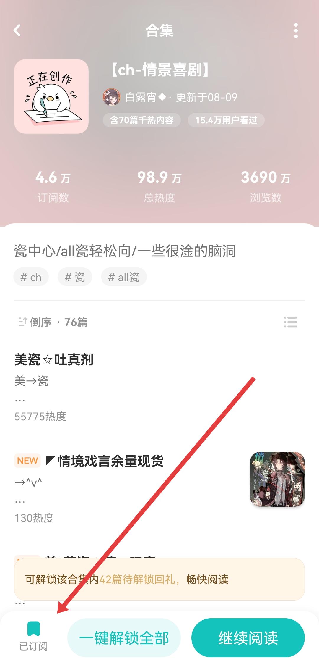 2、在已訂閱的合集中,找到需要取消訂閱的合集并點擊進入其詳情頁面,在頁面底部找到已訂閱按鈕并點擊。