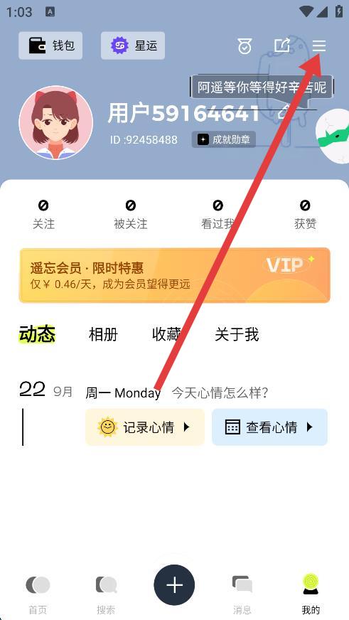 2、在我的頁面右上角,找到并點擊菜單圖標(biāo)。