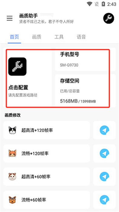 3、跟著教程設(shè)置好之后,玩家回到首頁欄后,將可以看見自己的手機型號以及手機儲存空間;