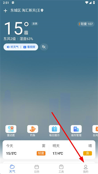 1、打開手機天氣預(yù)報app,點擊底部導航欄中的我的選項。