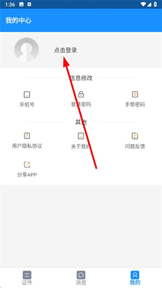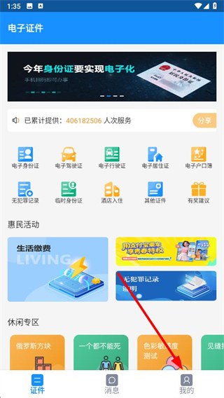 1、打開電子證件app,點(diǎn)擊底部導(dǎo)航欄的我的選項(xiàng)進(jìn)入個(gè)人中心頁面。