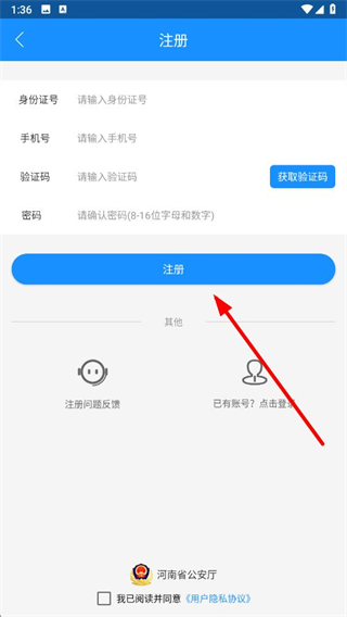 4、在注冊(cè)頁面中,依次在輸入框內(nèi)輸入信息,勾選我已閱讀并同意用戶隱私協(xié)議,點(diǎn)擊注冊(cè)完成賬號(hào)注冊(cè)。