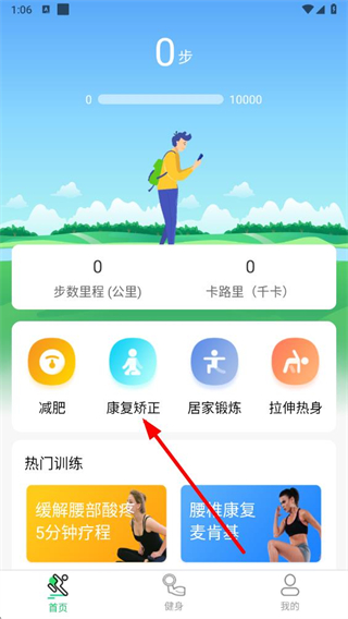 1、打開運(yùn)動走路計(jì)步器app,在首頁找到并點(diǎn)擊康復(fù)矯正選項(xiàng)。