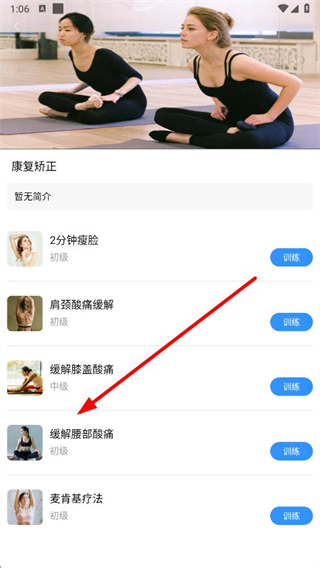 2、進(jìn)入康復(fù)矯正頁面后,在訓(xùn)練項(xiàng)目列表里,點(diǎn)擊緩解腰部酸痛右側(cè)的訓(xùn)練按鈕。