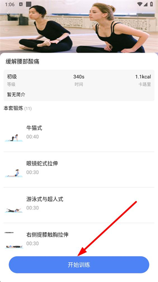 3、進(jìn)入緩解腰部酸痛訓(xùn)練詳情頁,確認(rèn)訓(xùn)練信息后,點(diǎn)擊下方的開始訓(xùn)練按鈕。