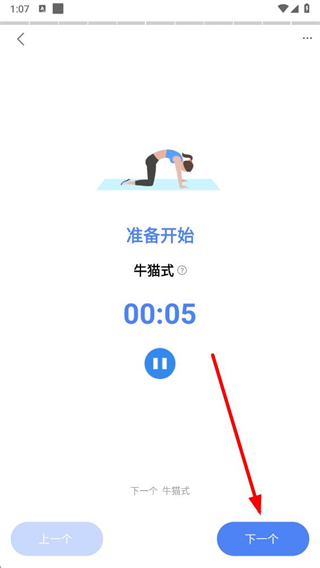 4、進(jìn)入訓(xùn)練界面,根據(jù)提示進(jìn)行動作練習(xí),完成當(dāng)前動作后,點(diǎn)擊下一個(gè)按鈕,繼續(xù)后續(xù)訓(xùn)練動作,直至完成整套訓(xùn)練。