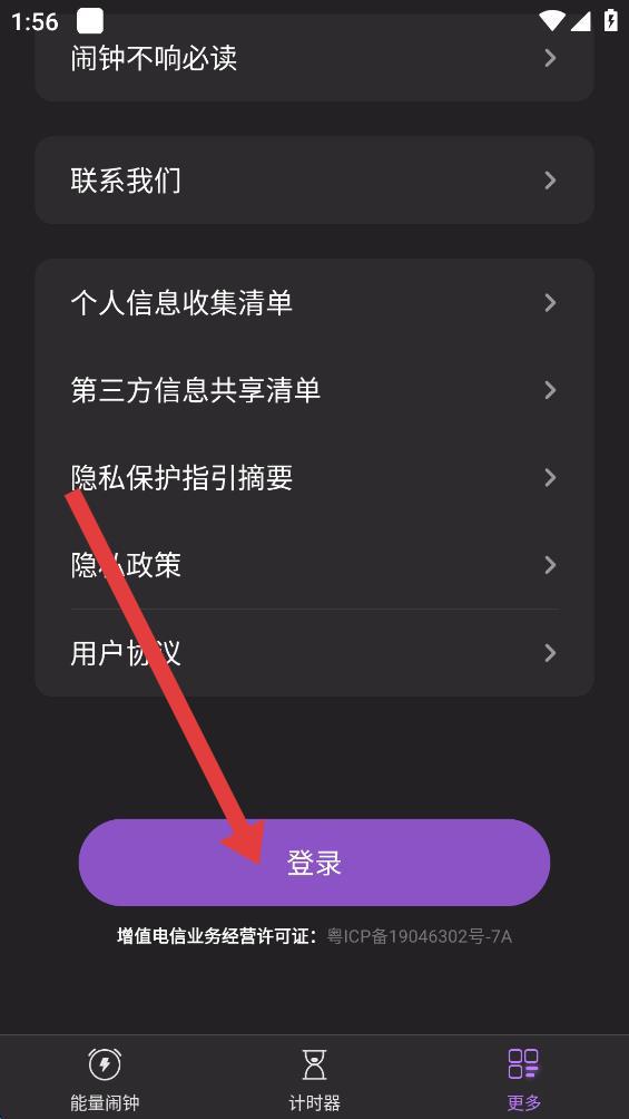 2、在更多設(shè)置界面中,找到并點(diǎn)擊登錄按鈕,進(jìn)入注冊(cè)登錄頁面。