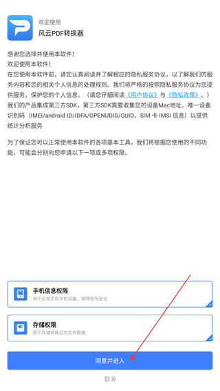 1、打開(kāi)風(fēng)云PDF轉(zhuǎn)換器APP,進(jìn)入時(shí)會(huì)彈出用戶協(xié)議和隱私政策,點(diǎn)擊同意并進(jìn)入的按鈕。