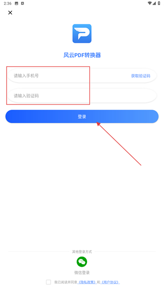 4、進(jìn)入登錄的頁(yè)面內(nèi),輸入手機(jī)號(hào)、驗(yàn)證碼,再點(diǎn)擊登錄的按鈕即可。