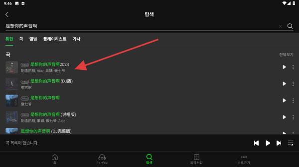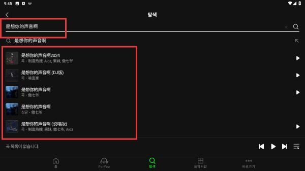 4、回車后,可點擊想要聽得曲目以及對應的歌手,點擊即可開始播放。