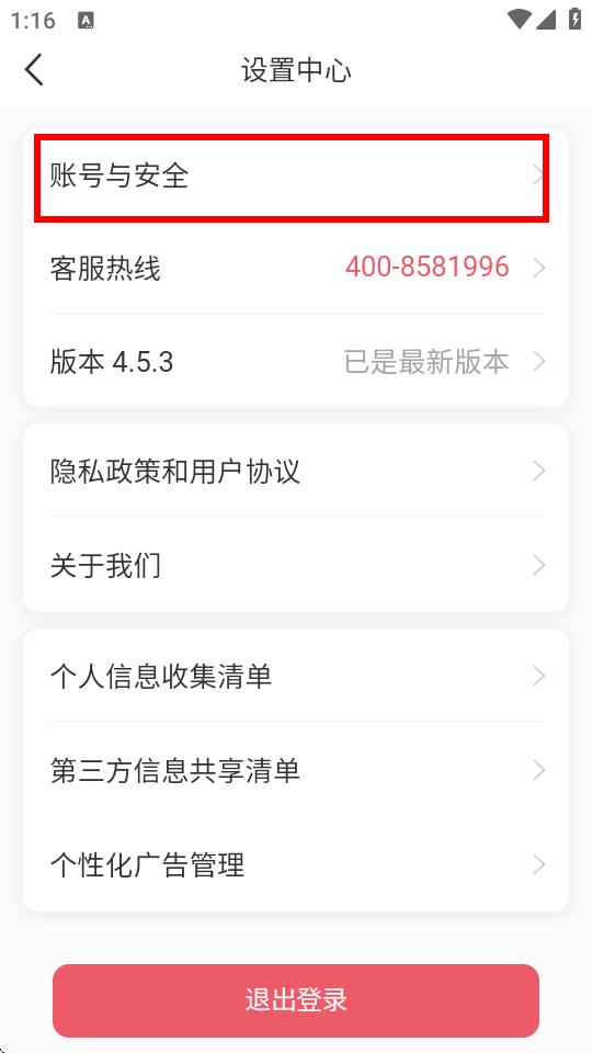 2、在設(shè)置中心界面里點(diǎn)擊賬號(hào)與安全進(jìn)入相關(guān)頁(yè)面。