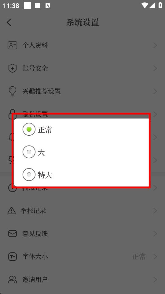 4、在彈出的字體大小選擇框中,選擇正常、大或特大,即可完成字體大小的修改。