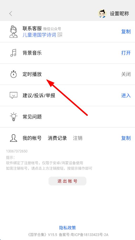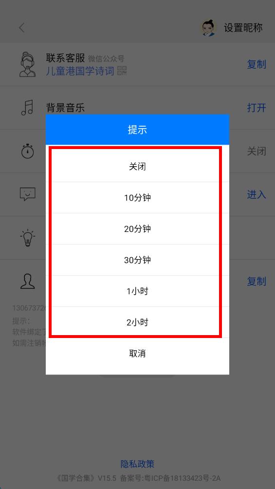 4、選擇好定時時長后,設置頁面可看到定時播放右側(cè)顯示所選時長,下方提示播放時間結(jié)束后關閉。
