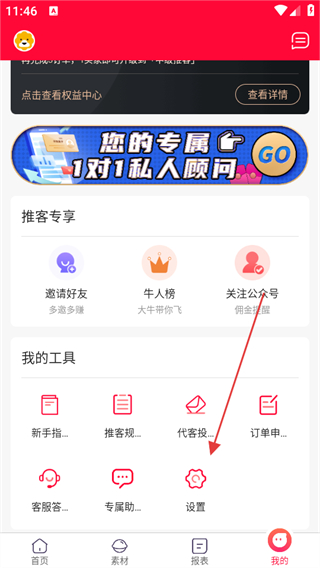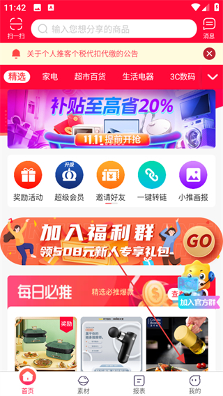1、打開蘇寧推客APP,點(diǎn)擊底部導(dǎo)航欄中的我的選項(xiàng)。