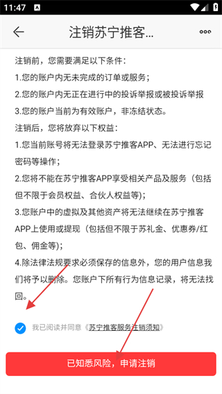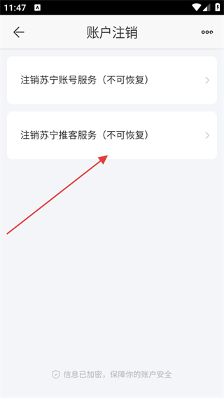 4、在賬戶注銷頁面,選擇注銷蘇寧推客服務(wù)。