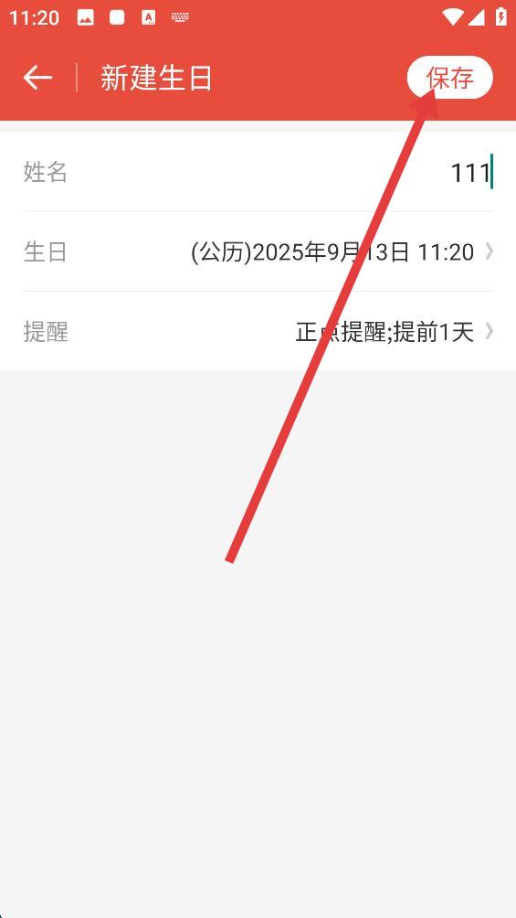 4、填寫好信息,點(diǎn)擊頁(yè)面右上角的保存按鈕,即可成功添加生日提醒。