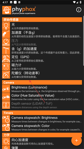 1、打開(kāi)phyphox應(yīng)用,選擇想要進(jìn)行的實(shí)驗(yàn)項(xiàng)目。